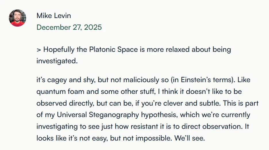 I asked Levin directly, in writing, multiple times: “What empirical result would make you say ‘I was wrong, there is no Platonic realm’?”