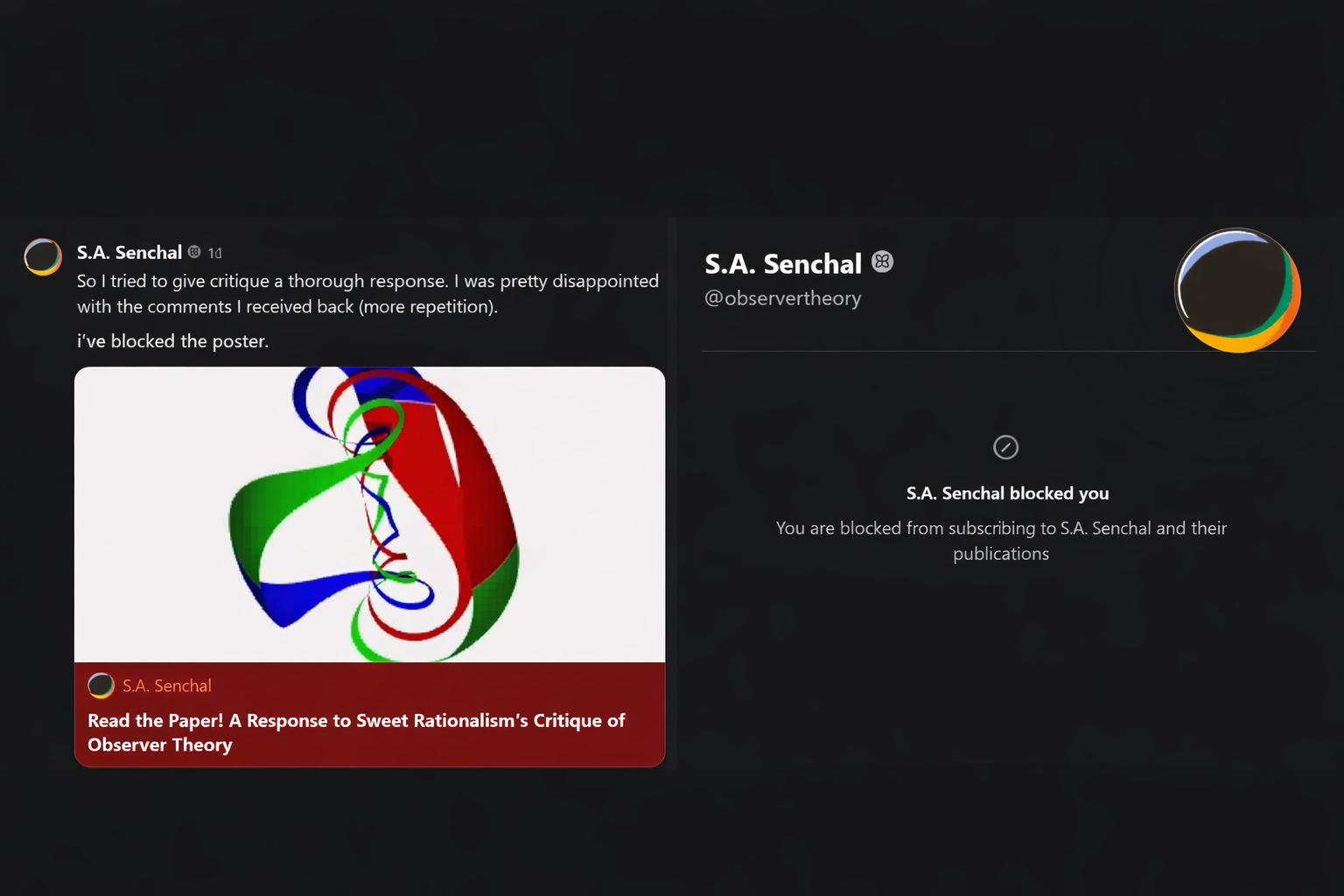 One practical note worth adding: I had the presence of mind to keep browser tabs of the conversation open before the block went back into effect, and I was able to screenshot the majority of the comment thread before it was deleted. Those screenshots will be published alongside the forthcoming analysis so that readers can read the exchange in full and draw their own conclusions about what motivated Senchal to delete it. If his defense of his article was genuinely thorough, if my responses were as repetitive and substanceless as his public announcement suggested, if the three unanswered questions were adequately addressed somewhere in the exchange, the screenshots will show that and readers are welcome to say so. If they do not show that, the question of why a scholar confident in his position would delete the record of that position being tested against a falsifiable competing model to their admitted unfalsifiable model is one I will leave readers to answer for themselves.