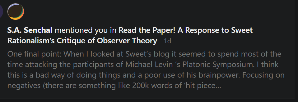 Before responding to a single substantive claim in Sam Senchal’s article “critiquing” my work (specifically my empirical critiques of Wolfram’s metaphysics and Sam’s God Conjecture/Observer Theory and my thermodynamically grounded constraint-based falsifiable alternative to their unfalsifiable unconstrained metaphysical frameworks), I want to correct the premise his article is built on, because nothing that follows makes sense without it. Senchal’s piece characterizes roughly 200,000 words of published work as an attack on participants in Levin’s Platonic Morphospace Symposium rather than what it is: documentation and empirical evaluation/observations following strict scholarly standards. Those same articles, which anyone can read, contain extended praise for Douglas Brash, Gordana Dodig-Crnkovic, Brian Cheung, Pavel Chvykov, David Resnik, and others by name, praising their empirical contributions specifically and at length. Not one participant was personally attacked in any article. The target was never the scientists or individuals (this is substance dualistic thinking anyways, which contradicts process-relational adjacent frameworks I advocate for). It was the unfalsifiable Platonic metaphysical framing those scientists do not need, that adds no explanatory power to their work, and that demonstrably hands the Discovery Institute a credentialing opportunity they have wasted no time exploiting that I objected to.