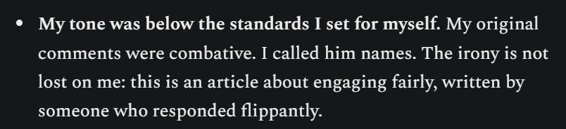Senchal’s claim that he was not attacking tool use is self-defeating on its own terms in at least two directions simultaneously. First, his own article’s Section I conceded explicitly that his tone was “below the standards I set for myself” and that he “called names,” which means he acknowledged making personal attacks in the very article that supposedly wasn’t making personal attacks. You cannot concede that your attacks were beneath your standards and then deny that attacks occurred. The concession and the denial cannot both be true, and he wrote both of them in the same document.