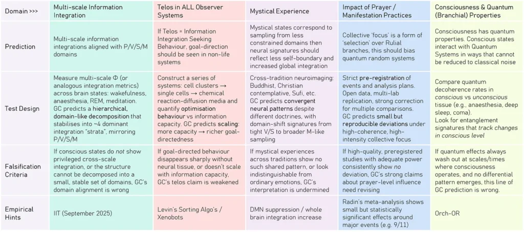 LAYER 2 — PRIOR PREDICTION THEFT: Every prediction in the formal falsification table was made by established theories 10–36 years earlier — IIT (2004), Global Workspace Theory (1988), Orch-OR (1996), Prigogine dissipative structures (1984), DMN suppression research (2011). The God Conjecture claims these as novel GC predictions.