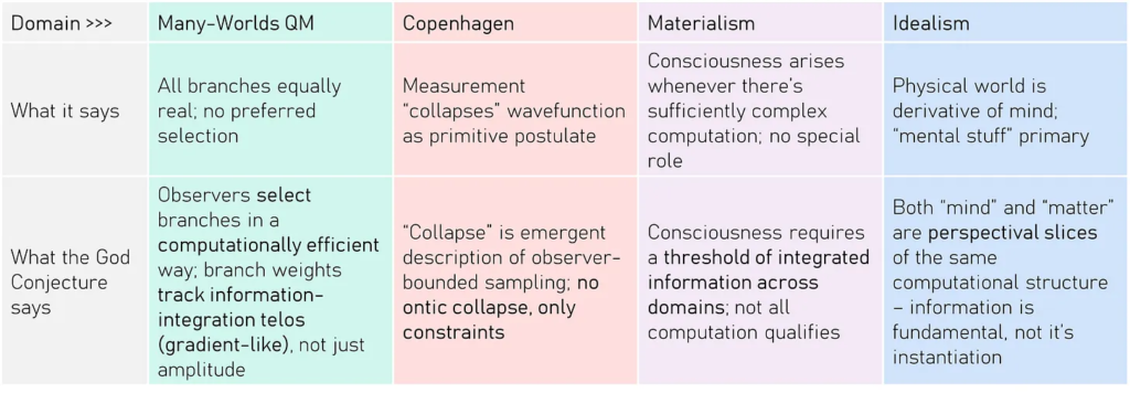 Senchal’s response article presents a falsification table claiming the God Conjecture makes ‘distinct predictions… different to current formalisms / positions in philosophy.’ Here’s his table from Section 4a: