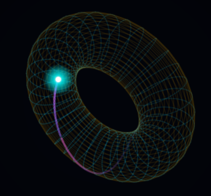 When the two rotation speeds are in irrational ratio, the orbit on the torus surface never exactly repeats but covers it densely over time. That quasiperiodic winding is what the intuition names as “recursive” and “spiral-like.” The intuition is tracking something real. The orbit is spiral-like. The shape it inscribes that path on is toroidal.